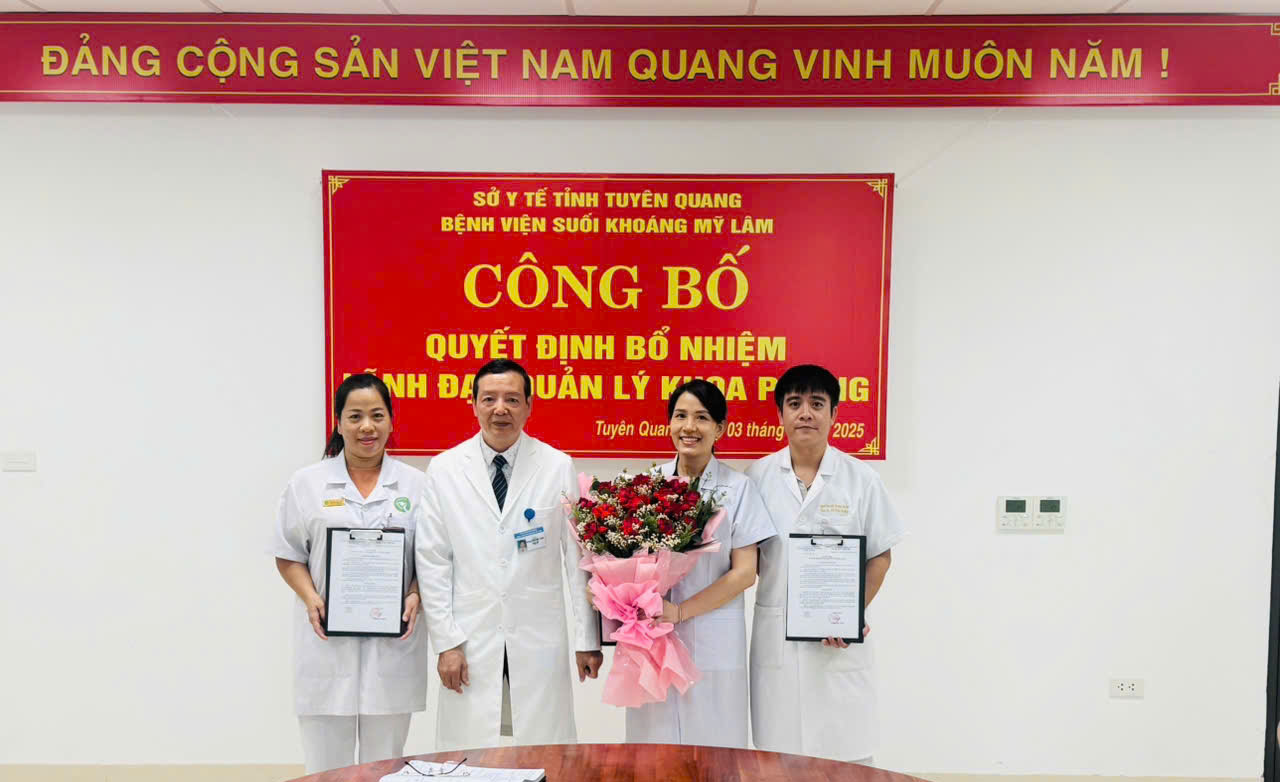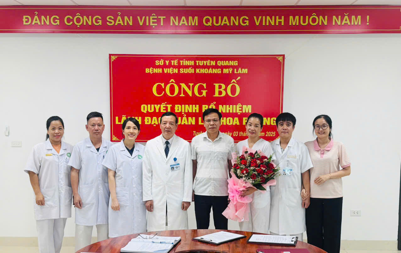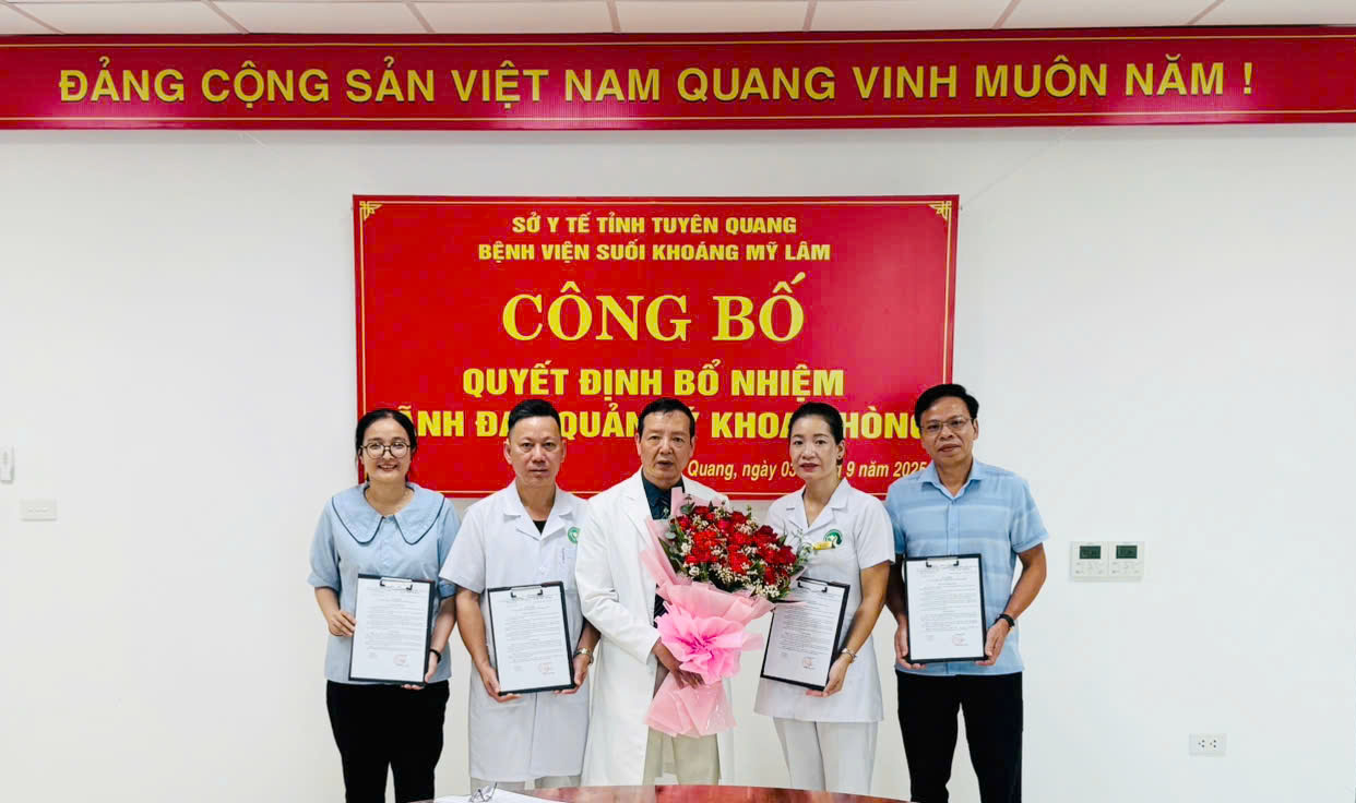 Chiều ngày 03/9/2025, Bệnh viện Suối khoáng Mỹ Lâm tỉnh Tuyên Quang tổ chức công bố và trao Quyết định bổ nhiệm mới đối với 09 viên chức giữ chức vụ lãnh đạo, quản lý tại các khoa thuộc Bệnh viện (do sắp xếp đơn vị hành chính tỉnh Tuyên Quang và tỉnh Hà Giang, thay đổi tên các Khoa, Phòng)